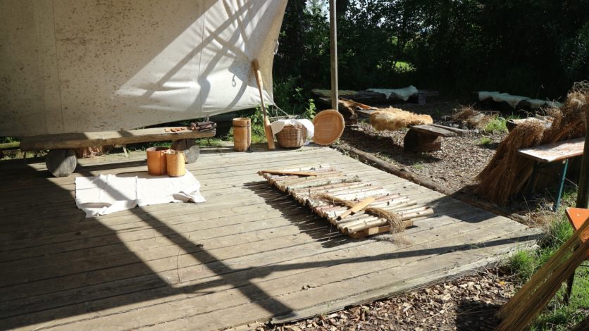 Nach einem freien Tag am Samstag wurde am Sonntag das Erlernte im musealen Kontext unter Echtbedingungen ausprobiert. Je ein Stand zum Thema Leinen, Bast, Weben und Rindengefäßherstellung wurden ausschließlich von den Studierenden betreut. Trotz des Dauerregens kamen mehr Besucher*innen als aufgrund des schlechten Wetters zunächst befürchtet. Zum Teil waren einige sogar extra wegen dieser Veranstaltung angereist! Hier zeigt sich, dass alte Handwerkstechnik auch heute noch auf großes Interesse stößt. Die Teams waren jedenfalls mit ihrer „Wassertaufe“ im Bereich Öffentlichkeitsarbeit und Vermittlung zufrieden. Ein nächstes kleines Projekt ähnlicher Art ist bereits angedacht….