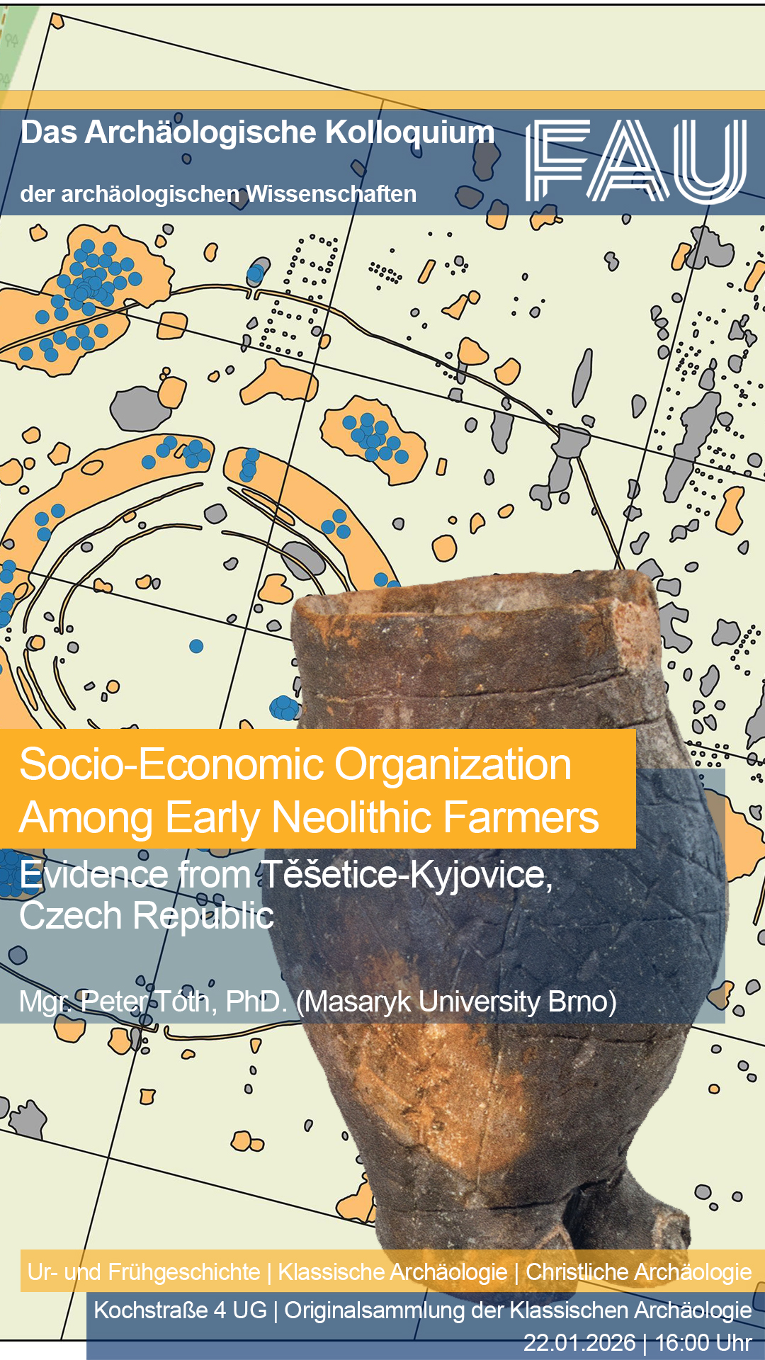 Am kommenden Donnerstag, dem 22.01.2026, laden die Institute der Archäologischen Wissenschaften zum Archäologische Kolloquium ein. Mgr. Peter Tóth, PhD. (Masaryk Univ. Brno) spricht über das Thema: „Socio-Economic Organization Among Early Neolithic Farmers: Evidence from Těšetice-Kyjovice, Czech Republic“.