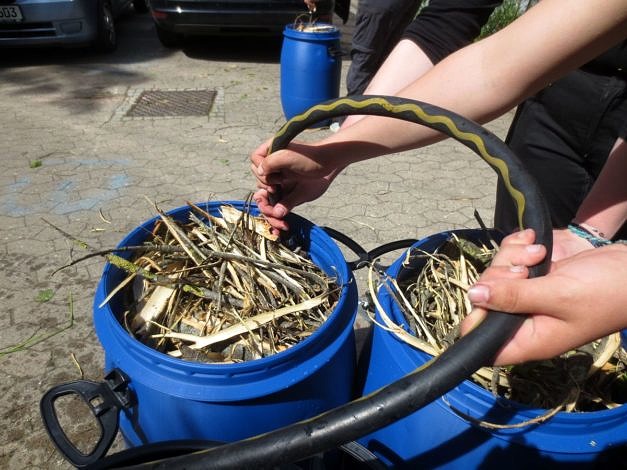 17.06.2019: Weitere zwei Wochen sind seit der letzten Überprüfung ins Land gezogen. Die geerntete Lindenrinde liegt nun seit etwas mehr als 4 Wochen zum Rotten in den Fässern. Spontan haben sich uns noch drei weitere Studierende angeschlossen, um in die Fässer zu schauen.