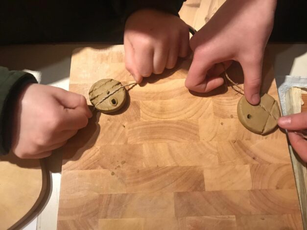 In der materiellen Kultur der Jungsteinzeit spielten Ton und Keramik eine wichtige Rolle. Wie man Anhänger aus Ton herstellt und verziert, wurde von den Mitgliedern der Vorzeitkiste gezeigt und erklärt. Anschließend konnte jeder ein eigenes Amulett herstellen und dieses durch das Eindrücken gezwirnter Schnüre mit Mustern verzieren. Diese Technik war bereits in der Jungsteinzeit bekannt und findet sich auf Gefäßen der Schnurkeramik wieder.