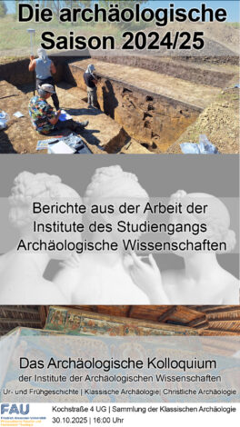 In dieser gemeinsamen Veranstaltung der drei Institute der Archäologischen Wissenschaften an der FAU werden regelmäßig namhafte Wissenschaftler aus dem In- und Ausland eingeladen, um über aktuelle Themen des Faches zu sprechen. Die Veranstaltung ist auch für Zuhörer von außerhalb der Universität offen und bietet eine perfekte Möglichkeit, sich über die Inhalte von Forschung und Lehre an der FAU hinaus auf dem Laufenden zu halten. Die Vorträge finden, solange nicht anders angekündigt, immer Donnerstags um 16:00 Uhr statt.
