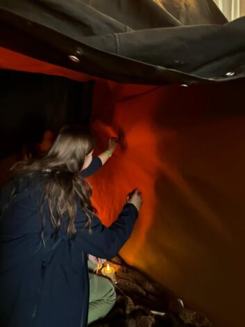 Das Highlight des diesjährigen Programms war wohl die im Seminarraum der Ur- und Frühgeschichte aufgebaute Höhle, die die Vorzeitkistler mit Liebe zum Detail gestaltet hatten. Vor allem bei kaltem Wind bot die Höhle einen gemütlichen Ort zum Verweilen. Unter Flötenklängen und im warmen Lichtschein konnten die Kinder die Technik der sog. finger flutings nachempfinden und in der Höhle selbst mit Ocker und Kohle zu Künstlern und Künstlerinnen werden.