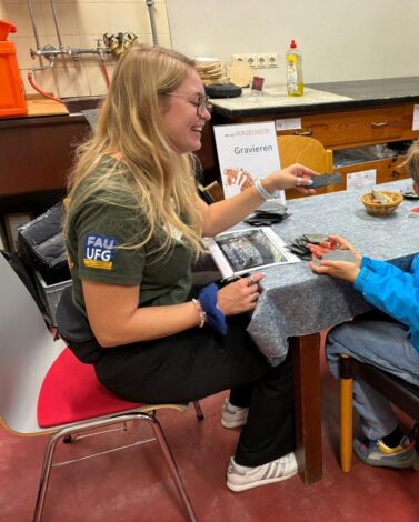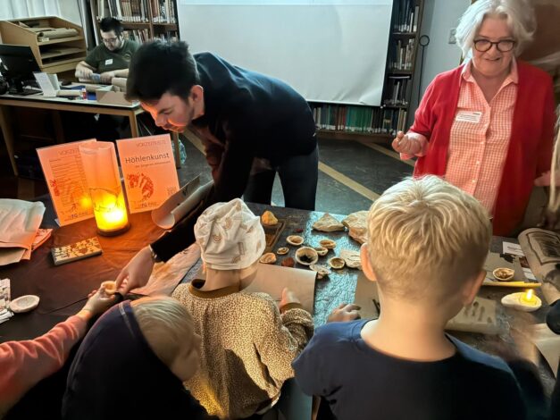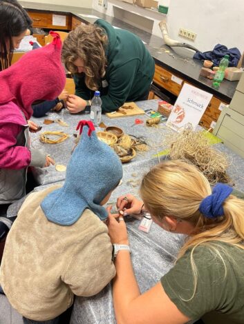 Auch dieses Jahr gab es wieder eine Station in der Werkstatt. Mit urgeschichtlichen Materialien konnten die Kinder eigene Schmuckstücke aus Muscheln, Knochen und Federn kreieren und sich auf Schieferplatten an Ritzzeichnungen probieren – alles mit Unterstützung der Vorzeitkistler und mit archäologischen Beispielen zur Inspiration.